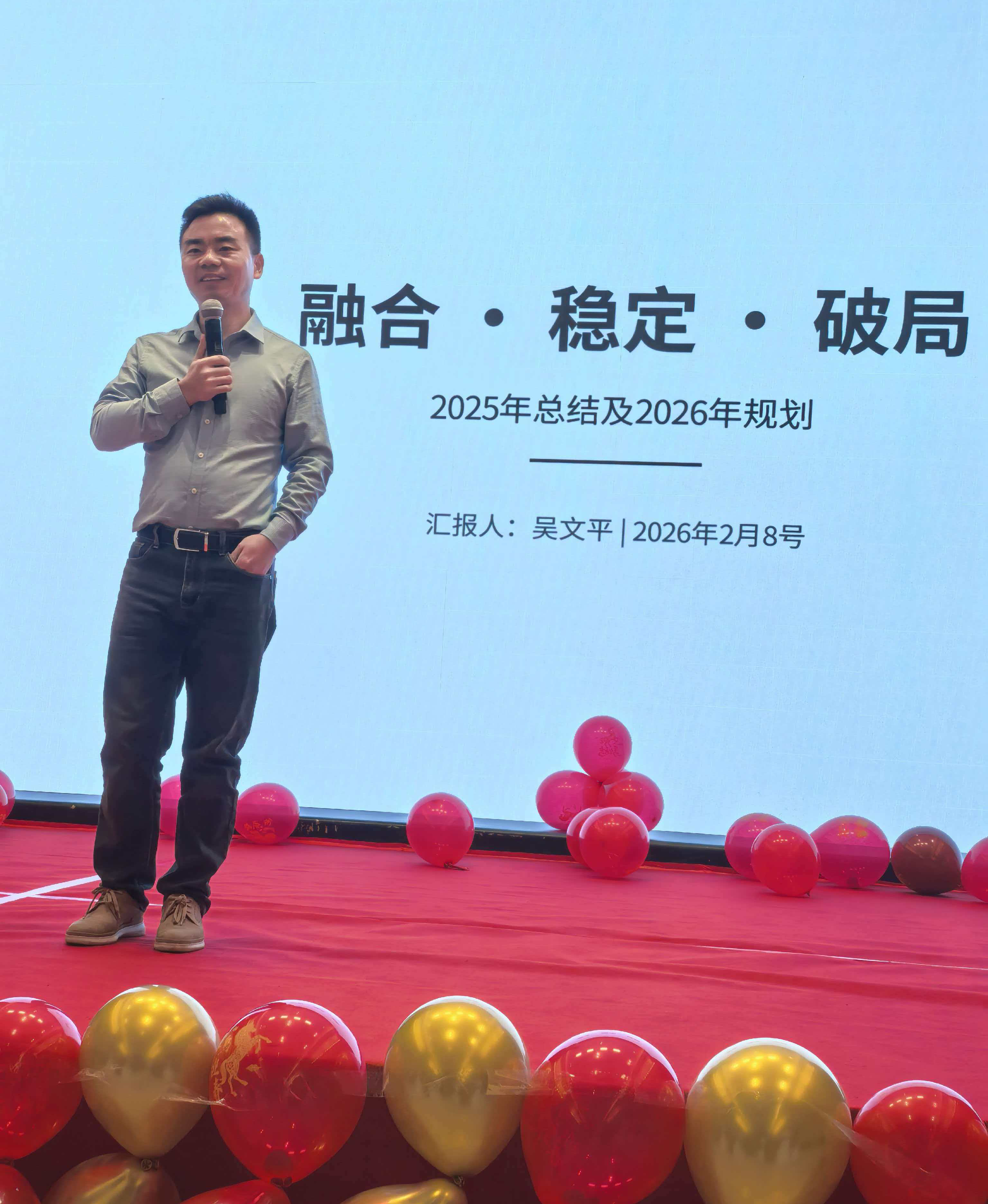 年会在热烈的掌声中拉开帷幕。信为通讯总经理吴文平作年度工作汇报,系统回顾了2025年公司在市场开拓、产品创新、内部管理与团队建设等方面取得的成绩,并深入分析当前形势,对2026年的发展目标与重点方向进行了全面部署。